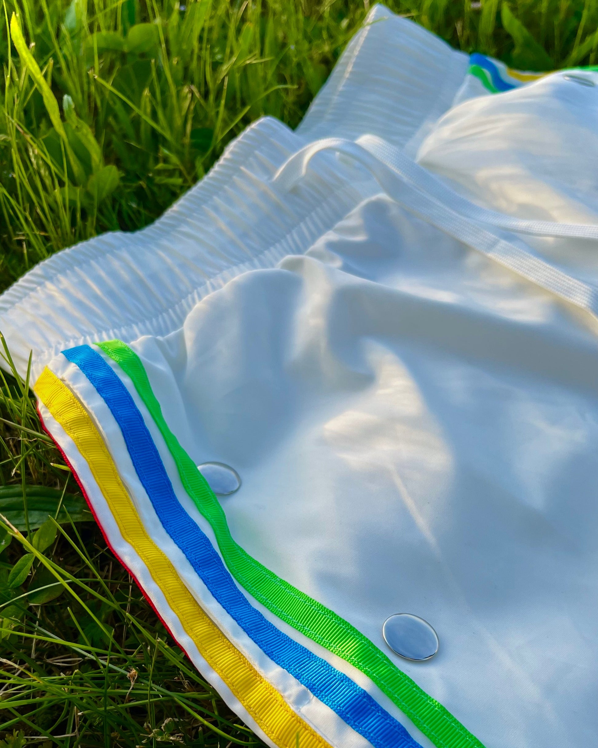 - On the front: clean white with vibrant blue and green, stripes down the sides and "YOUR TYPE" printed on the legs.
