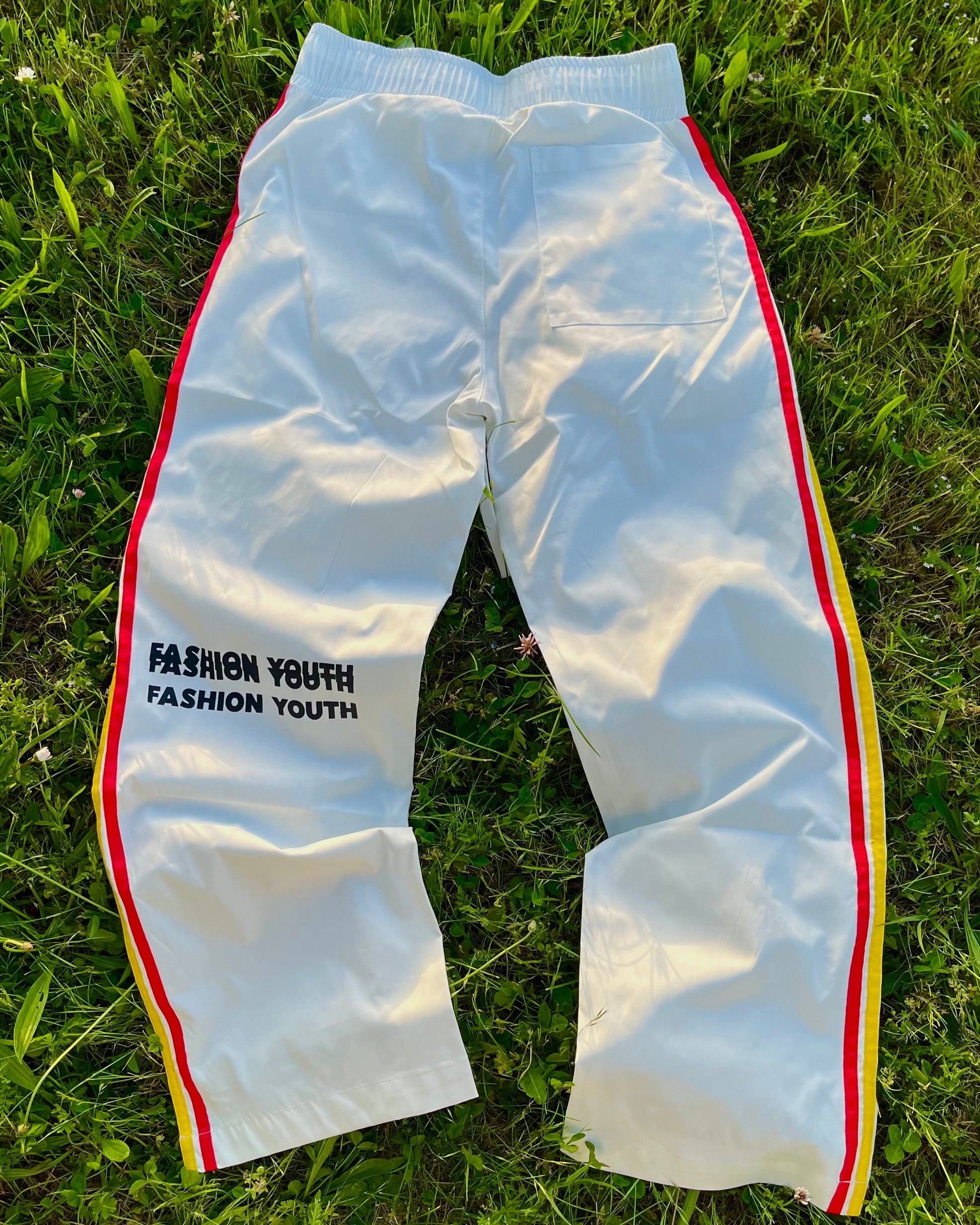 - On the back: fiery red and yellow striped sides with "FASHION YOUTH" printed tree times on the left leg.